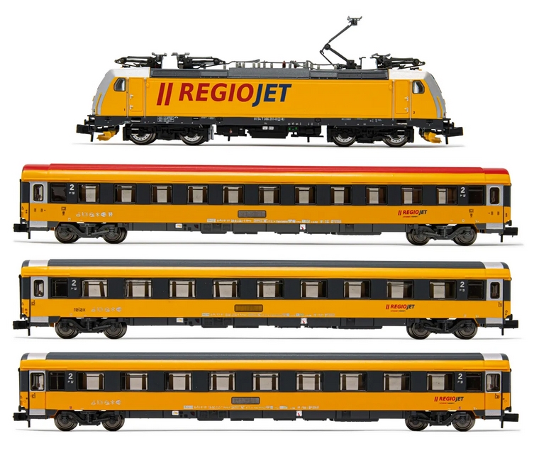 Regiojet, 4-tlg. Zugset, bestehend aus 1 x Elektrolokomotive BR 386 und 3 x Reisezugwagen, Ep. VI