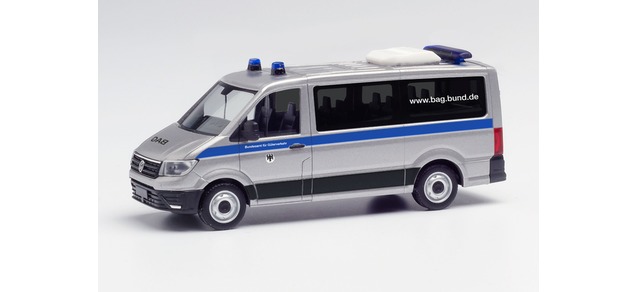Formneuheit! Aktuell werden vom Bundesamt für Güterverkehr aktuelle VW Crafter mit flachem Dach als Kontrollfahrzeuge eingesetzt. Der silbermetallicfarbene Bus mit geschlossenen Hecktüren wird mit einer Standklimaanlage, einem Warnlichtbalken und zwei Rundumleuchten vorbildgerecht als Miniaturmodell realisiert.
