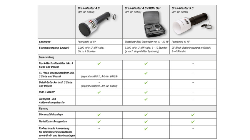 Der NOCH Gras-Master 3.0 PROFI wurde für höchste Ansprüche von Modellbau-Profis entwickelt. Eine Leistung von bis zu 16kV lädt die Gras-Fasern elektrostatisch auf.