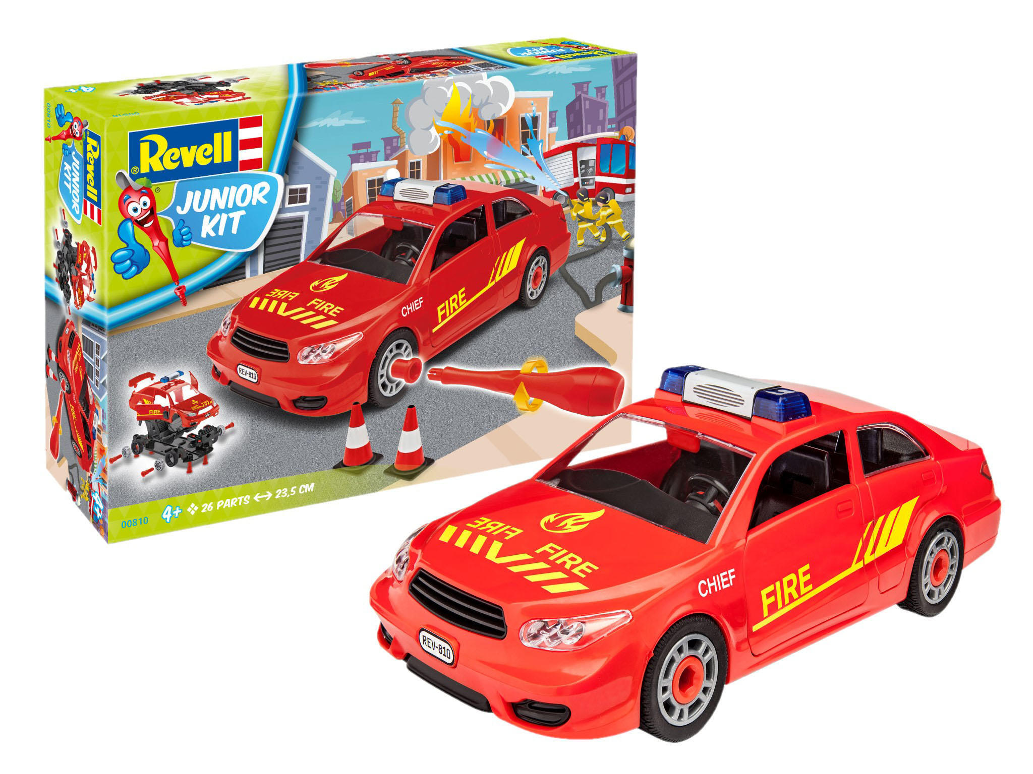 Einsatzleitung bitte kommen! Der Einsatzleiter wird am Einsatzort benötigt. Mit deiner schnittigen Limousine bist du blitzschnell vor Ort und koordinierst den Einsatz deiner Feuerwehrleute. Kleine Feuerwehr-Fans ab 4 Jahren können sich ihr eigenes Einsatzleiter-Fahrzeug selbst zusammenbauen. Kindgerecht und mit dem beiliegenden Schraubendreher ohne jeden Kraftaufwand. Die farbige, leicht verständliche Bauanleitung führt dabei Schritt für Schritt zum Ziel. - Einfacher Zusammenbau - Robuste Bauweise - Wieder auseinanderbaubar - Türen und Kofferraumklappe beweglich - Innenraum mit vielen Details - 2 Pylonen - Dekoration über beiliegende Aufkleber Lieferumfang: