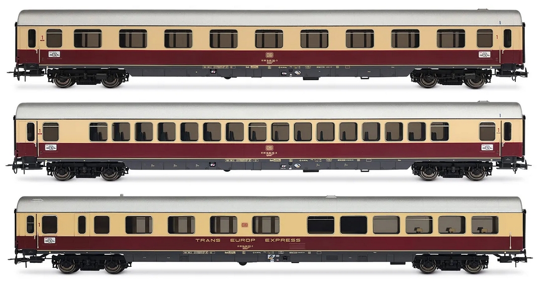 HR4373 DB, 3-tlg. Set Reisezugwagen „TEE Bavaria" in rot/beiger Lackierung, bestehend aus 1 x Apmz, 1 x Avmz, 1 x ARDm, Ep. IV