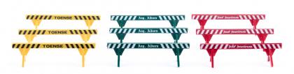 Die Baustellen- und Schwertransport-Themen genießen bei WIKING-Freunden einen hohen Stellenwert. Schon deshalb pflegen die Traditionsmodellbauer diese Modell-Zyklen mit immer neuen, vor allem attraktiven Miniaturen. Da ist es nur folgerichtig, dass für die Dioramenfreunde die Absperrschranken im unternehmensindividuellen Auftritt folgen. Dementsprechend hat WIKING dieses Zubehör in den Farben von August Alborn, Paul Rosenkranz und Toense gestaltet. Jeweils drei Absperrschranken: Grün für August Alborn, Rot für Paul Rosenkranz und Gelb für Toense. Den Absperrschranken liegen drei Aufkleberbögen bei.